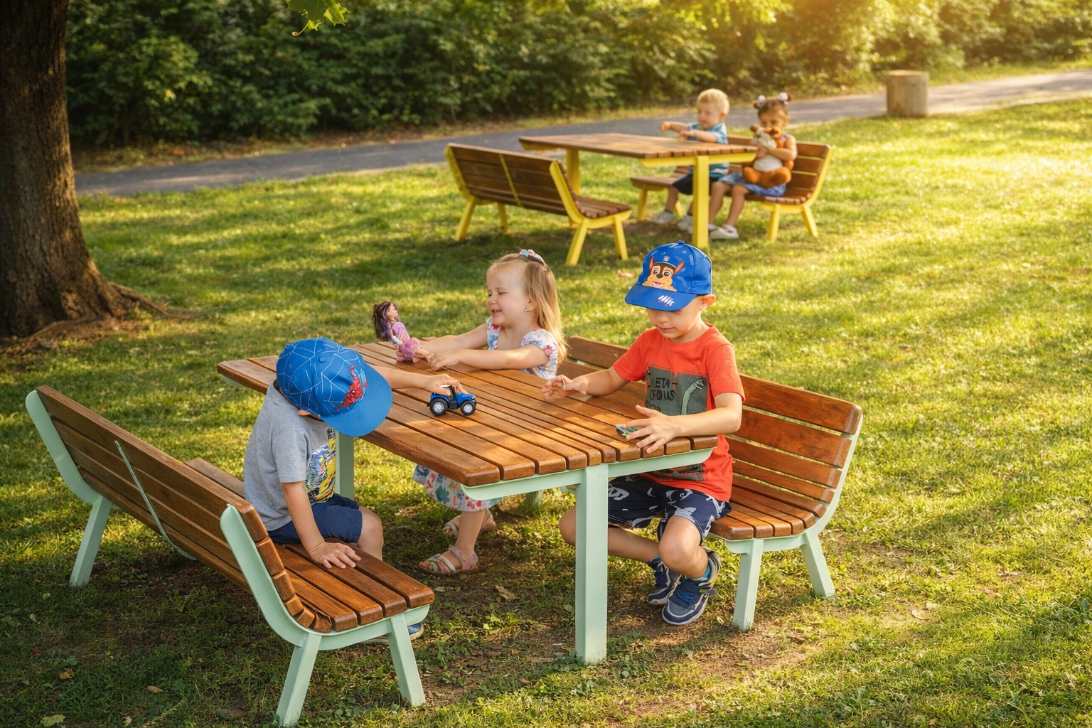 Kolekce mobiliáře Lany obsahuje kromě dětských laviček samozřejmě i lavičky pro dospělé a také stoly.