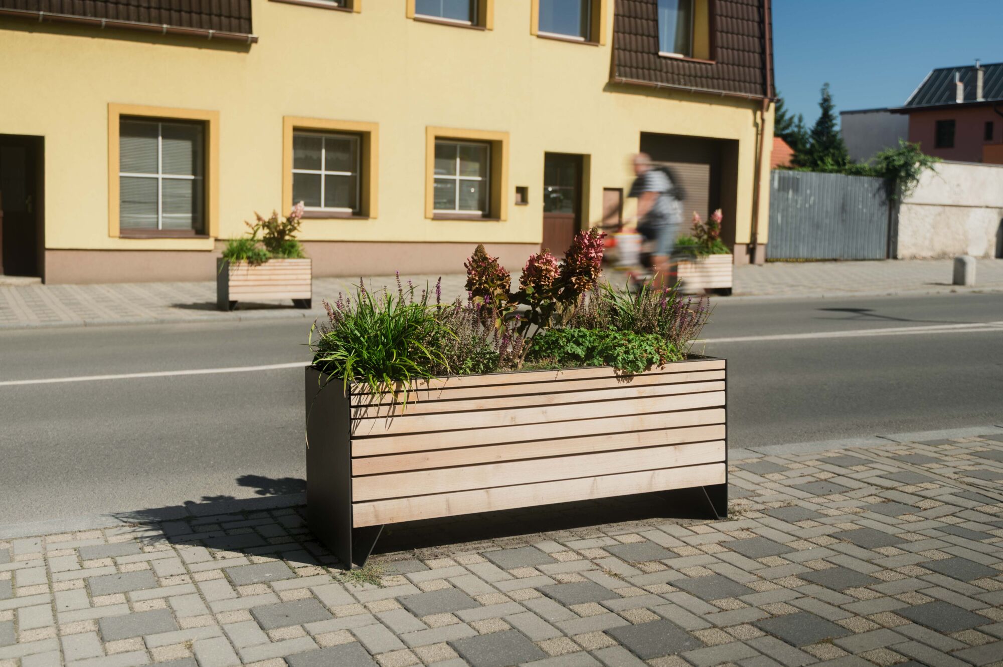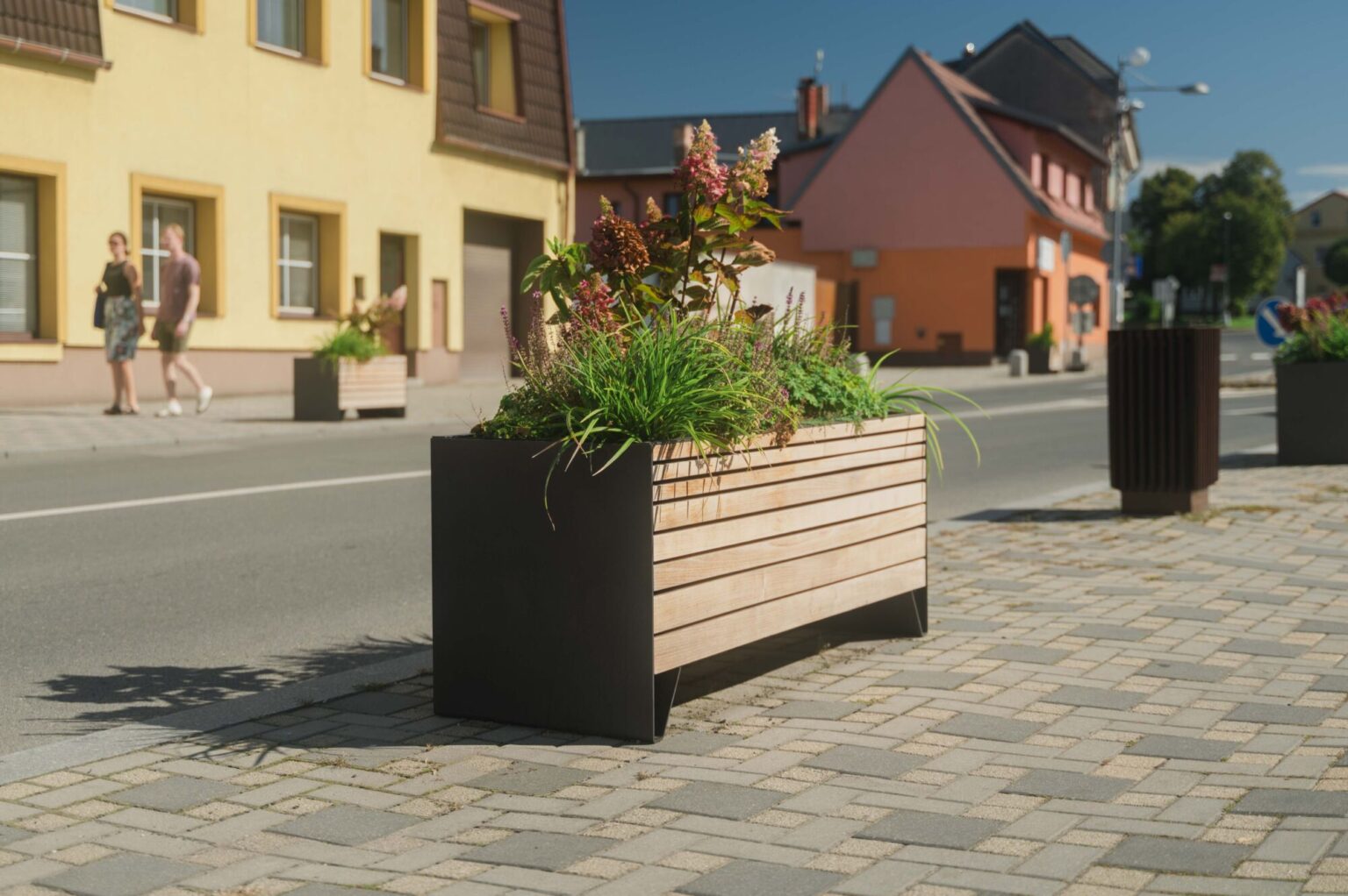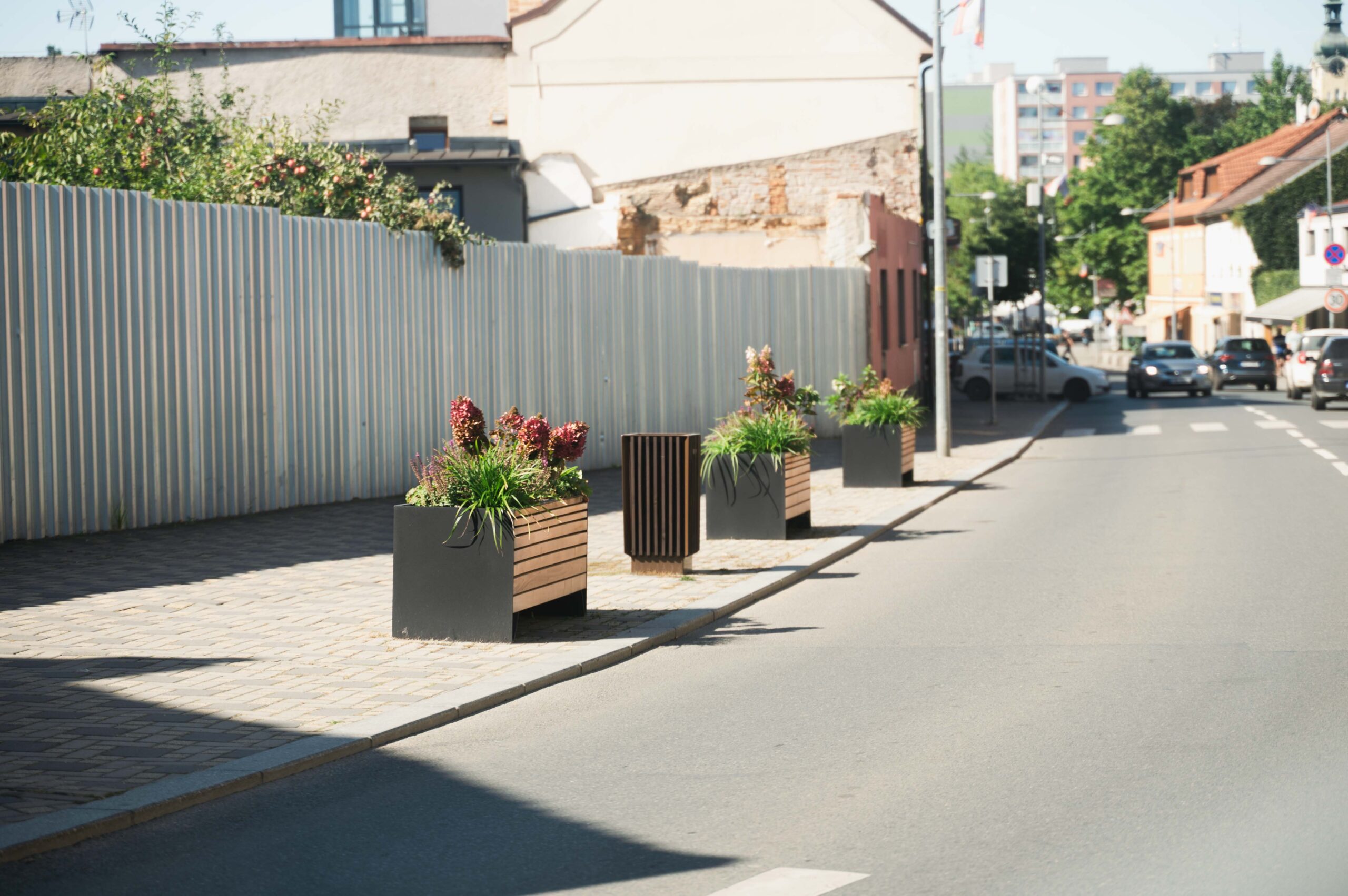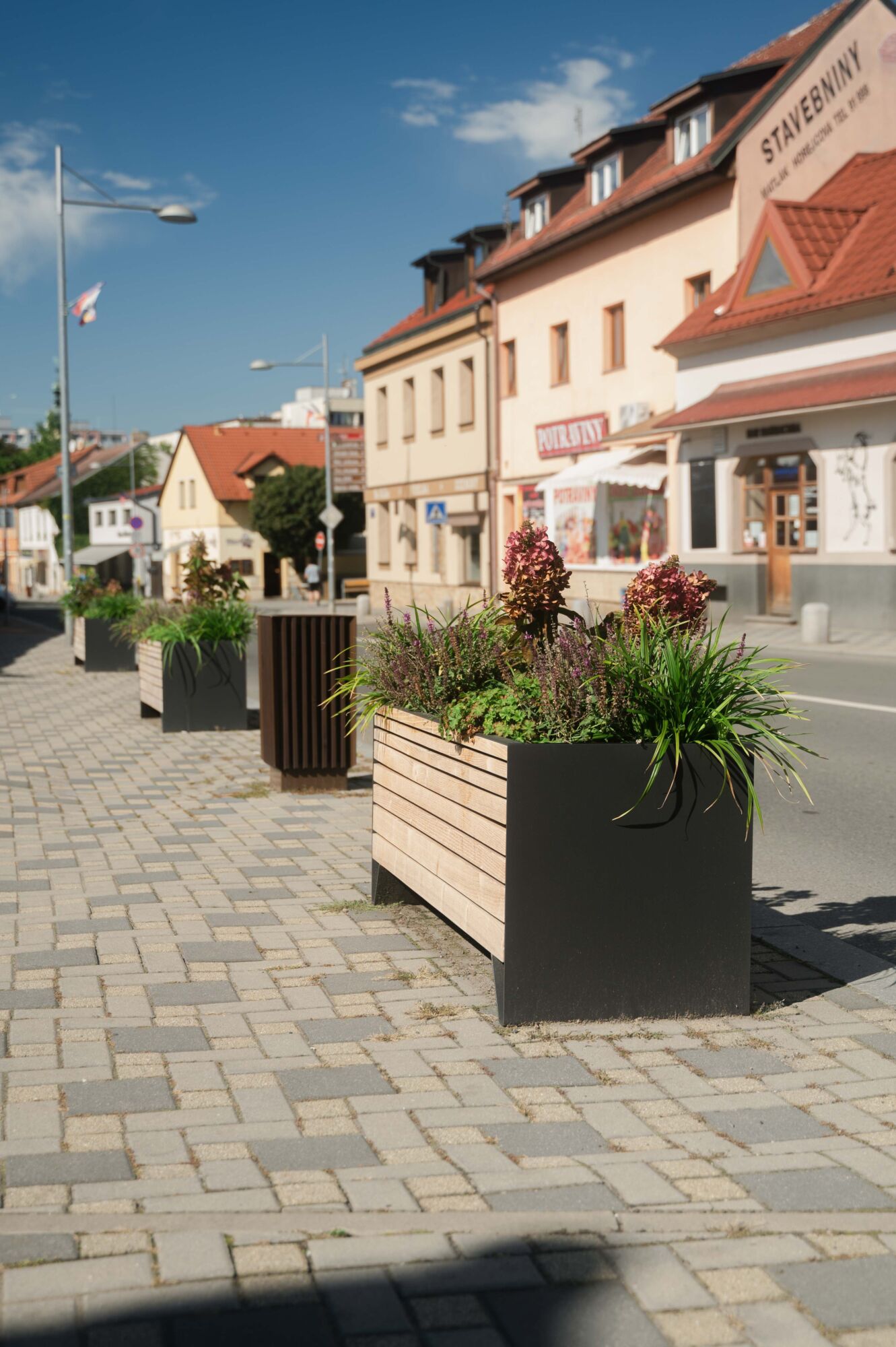 Pomocí spojení květináčů s lavičkami docílíme nejen příjemného sezení v obklopení zeleně i na betonovém náměstí, ale také tím vzniká optické přehrazení prostoru.