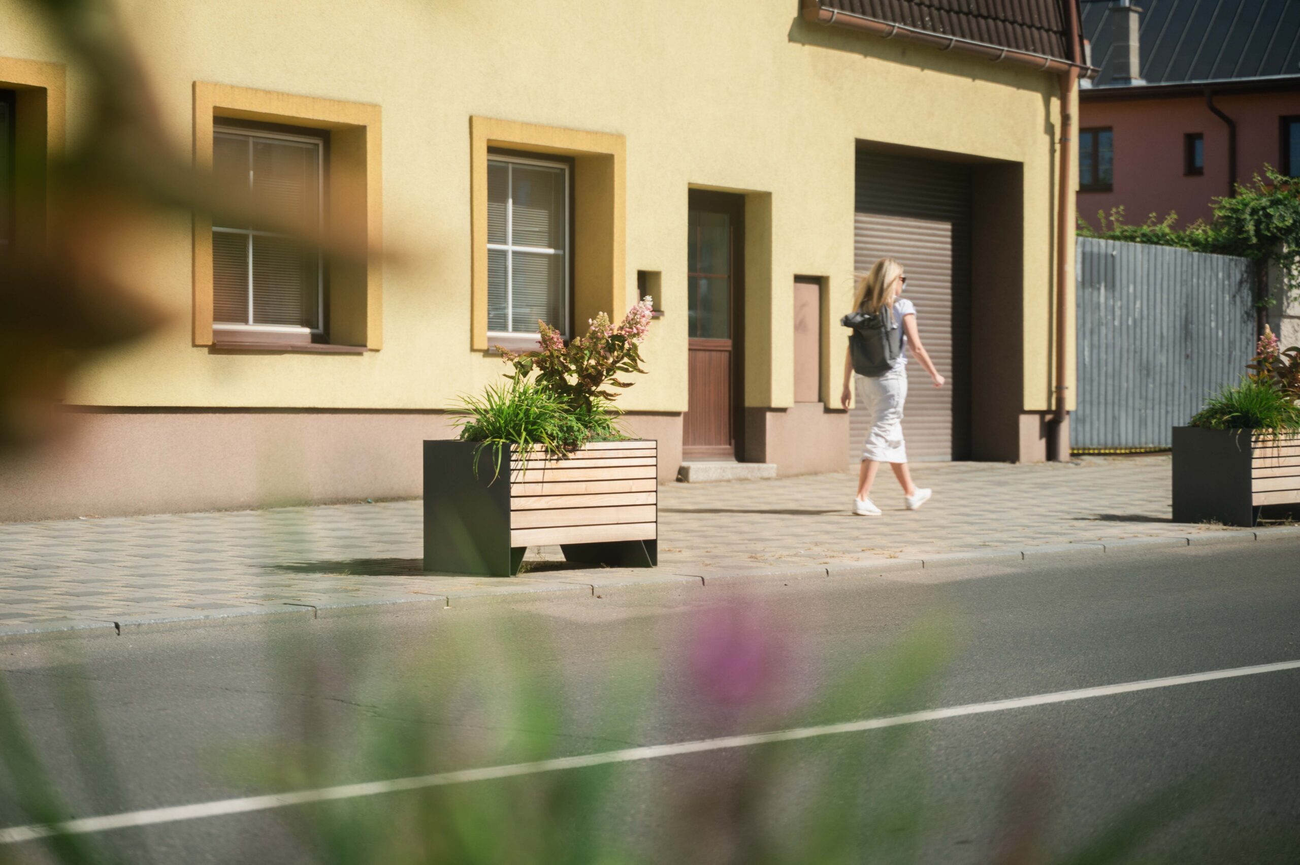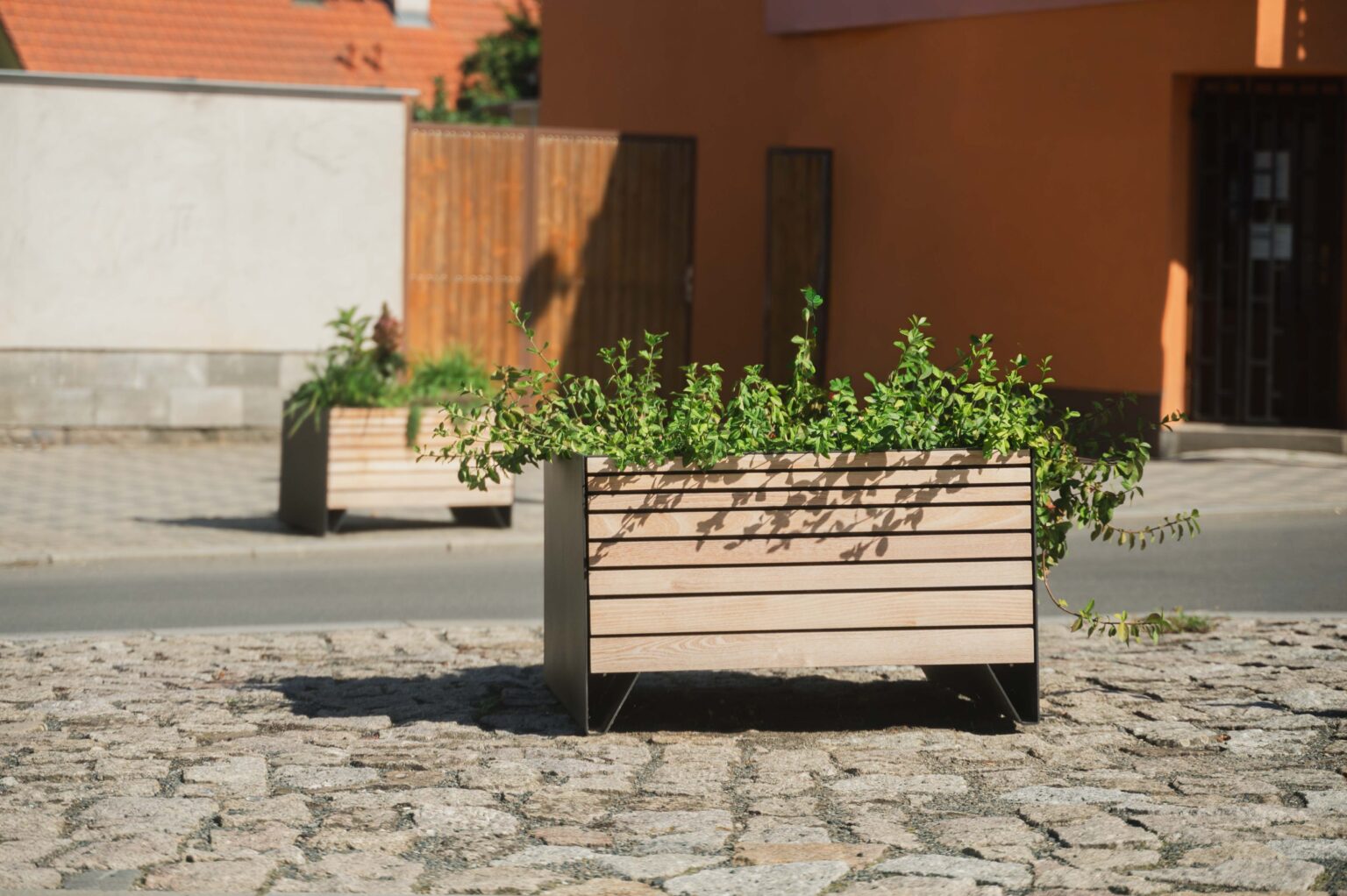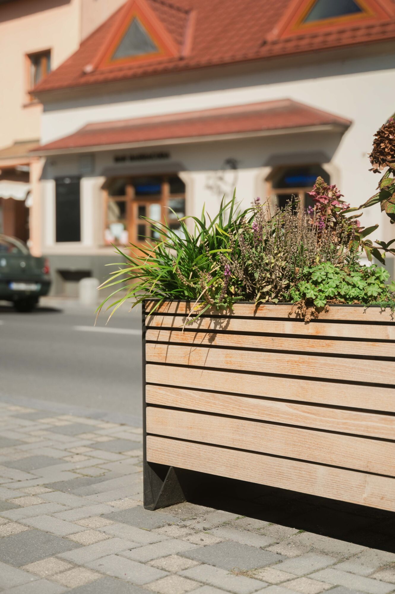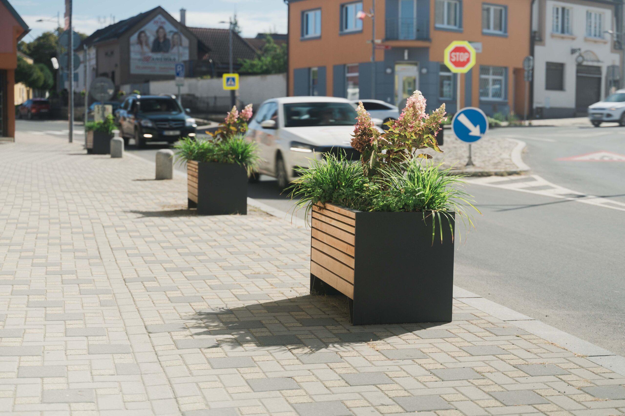 Pomocí spojení květináčů s lavičkami docílíme nejen příjemného sezení v obklopení zeleně i na betonovém náměstí, ale také tím vzniká optické přehrazení prostoru.