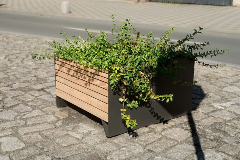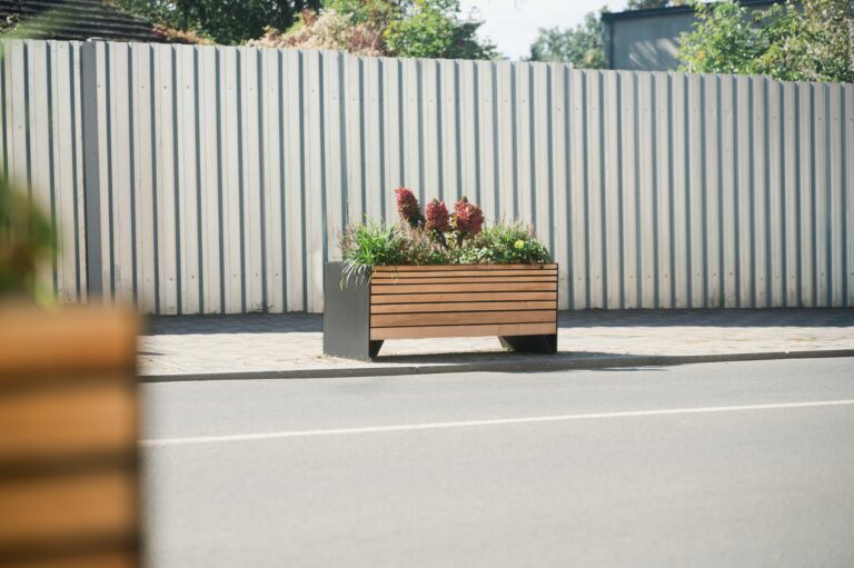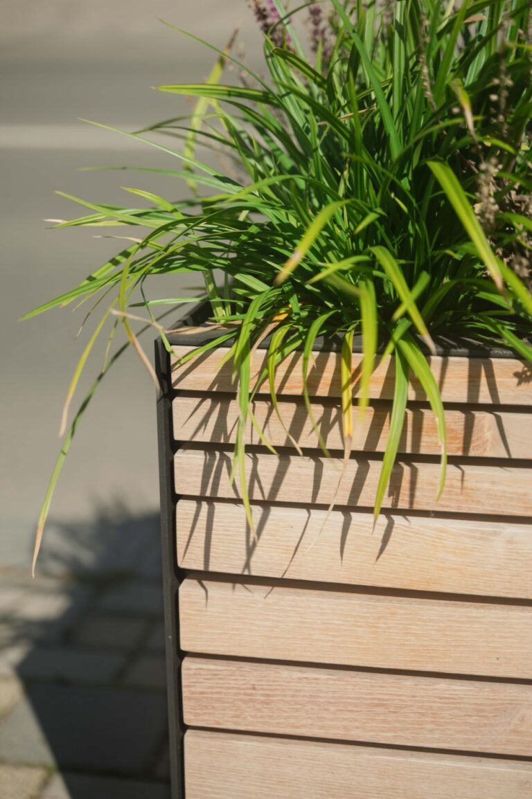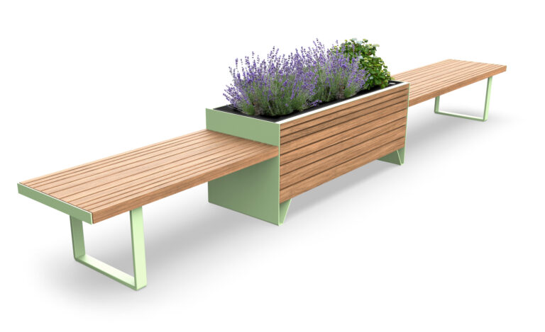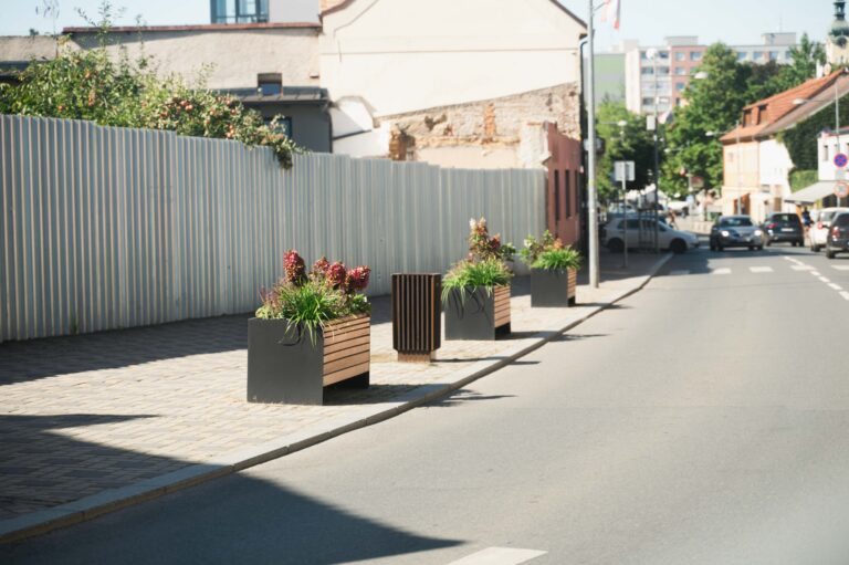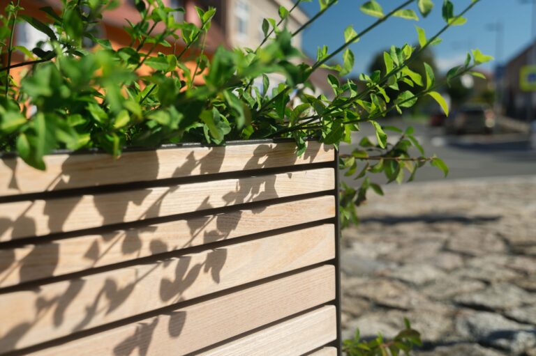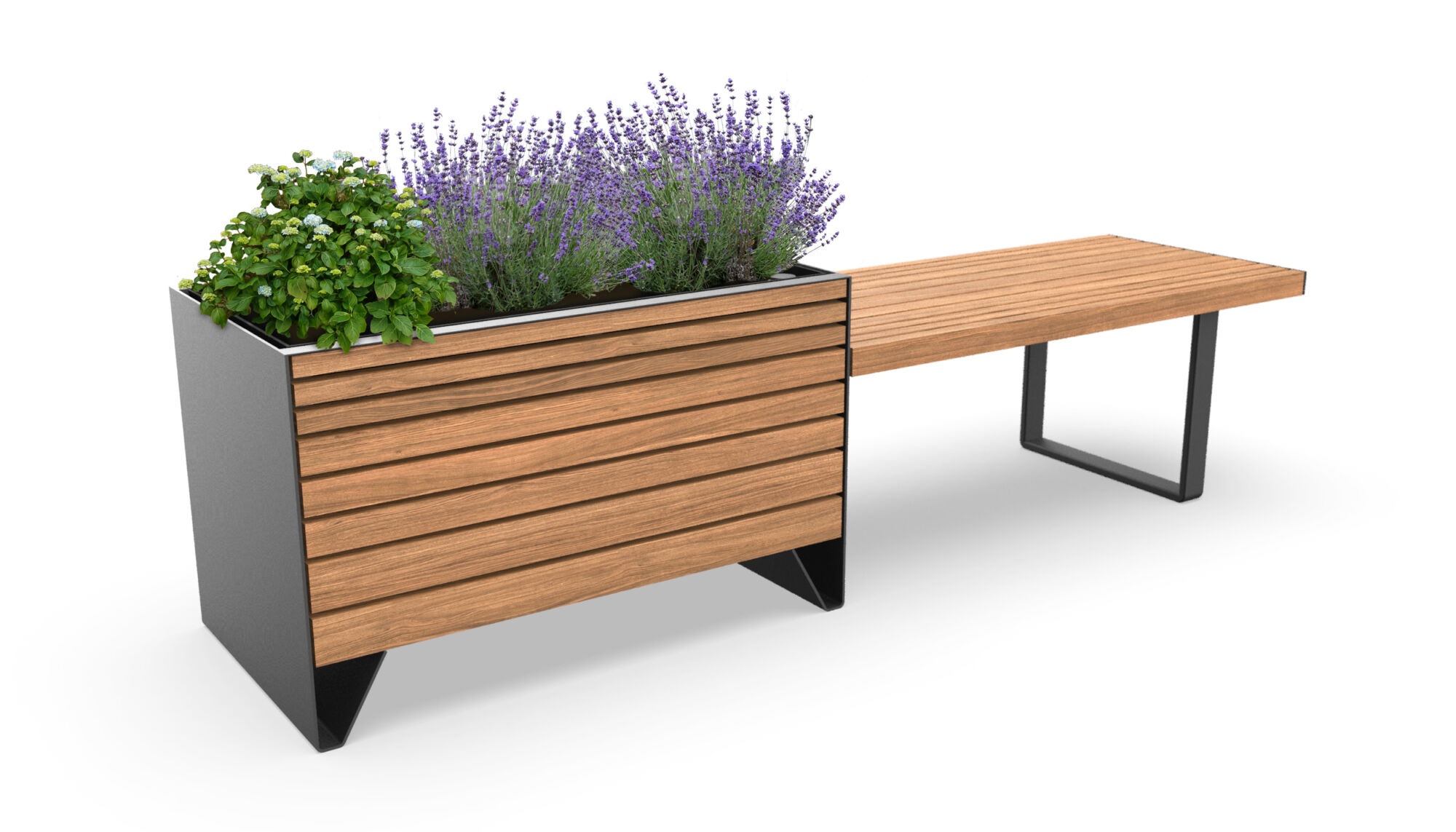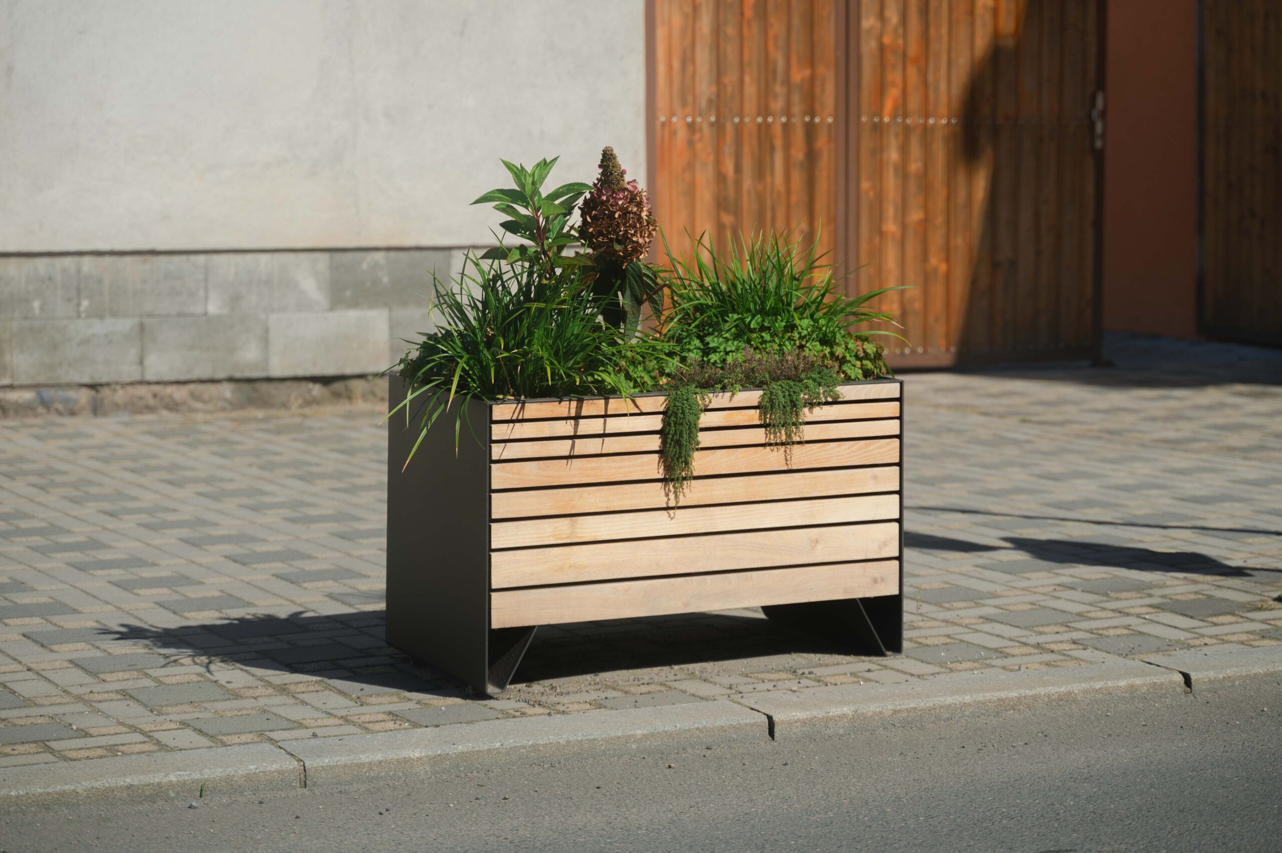 Pomocí spojení květináčů s lavičkami docílíme nejen příjemného sezení v obklopení zeleně i na betonovém náměstí, ale také tím vzniká optické přehrazení prostoru.